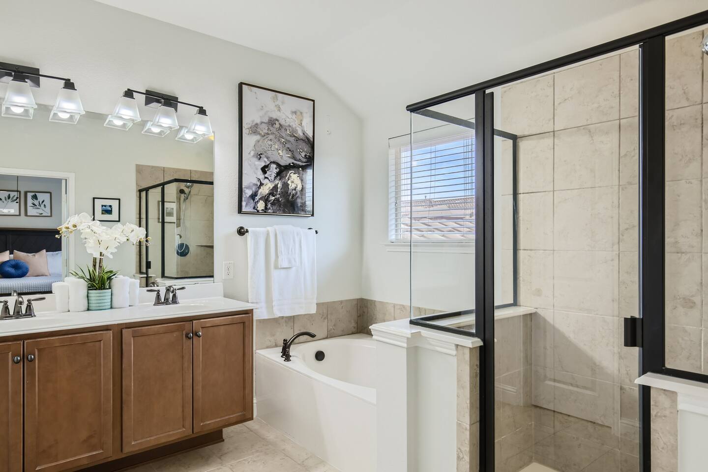 Enter to a spacious first floor study on your left - easily converted to a guest room. Past the open kitchen and family room you'll find the laundry room, 2 car garage and private patio entrances. The primary bedroom with en-suite bath features a jetted tub and glass enclosed shower. The secondary bedroom can be configured as shown (King bed) or with two twin beds.