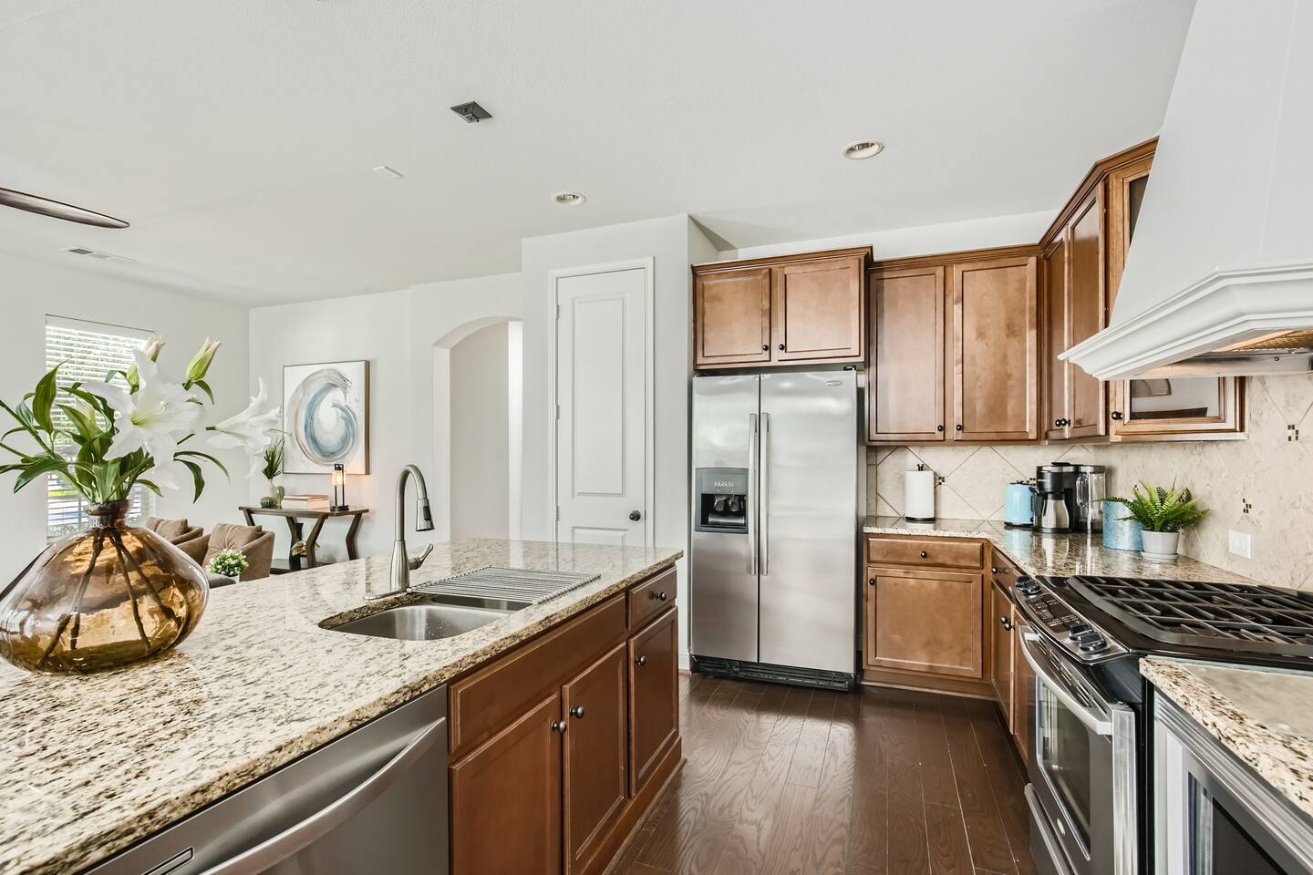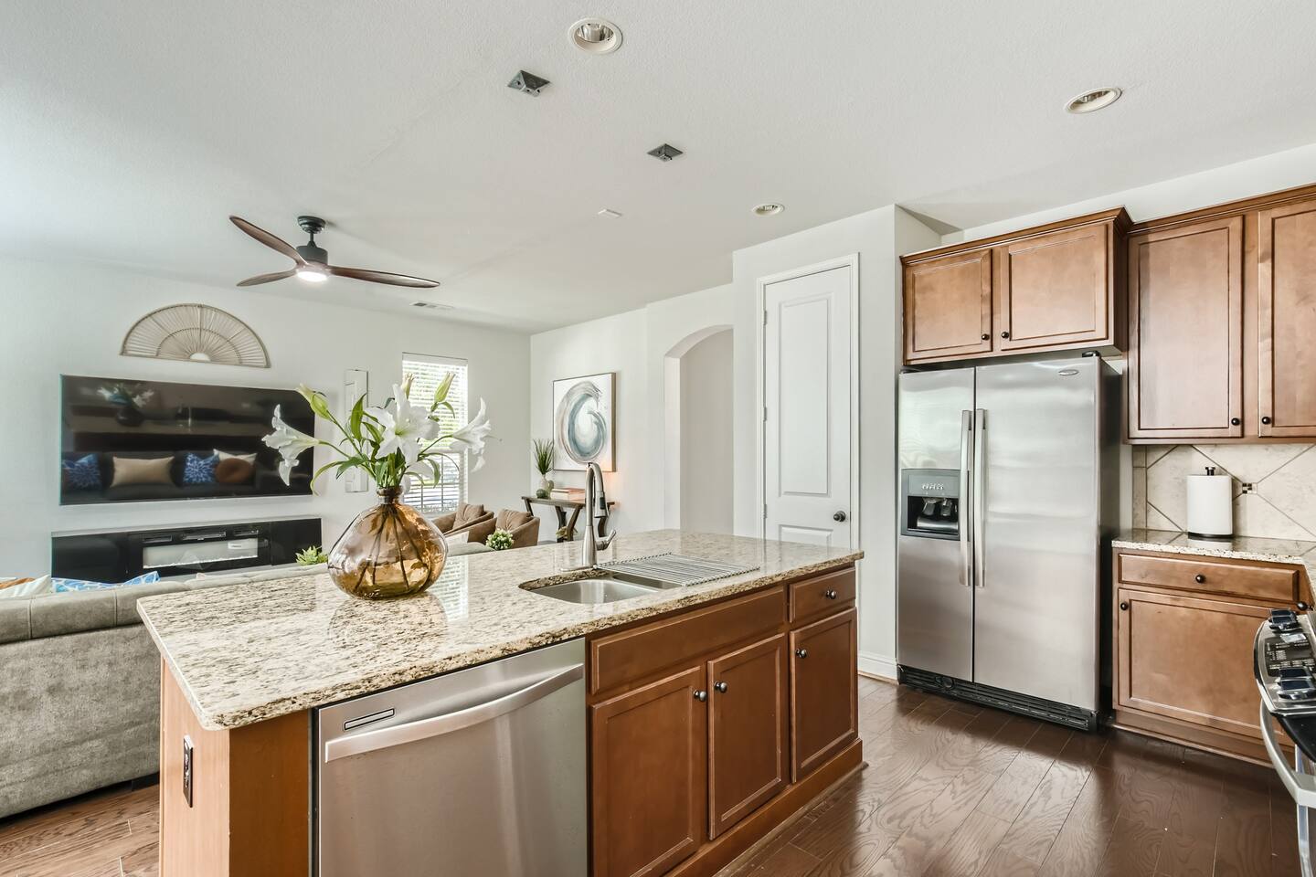Solid granite countertops and gleaming stainless appliances complement the spacious chefs kitchen. The sleek entertainment center has an integrated heater and flame effect to create a cozy feel. The 65" Sony TV comes with with access to all major TV apps streamed flawlessly over blazing fast WiFi. Beautiful crown molding and wrought iron accent the living area and stairway. Don't miss the opportunity to live in this super clean, comfortable and worry free home.